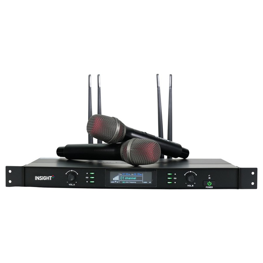 Fixed dual frequency wireless microphone system- Encrypted Digital Audio- 863 – 865 Mhz frequency range- 30 meter/ 100 feet range- 50 Hz -15 KHz frequency response- Cardioid dynamic capsule- Low-profile metal desktop receiver with two foldable antennas